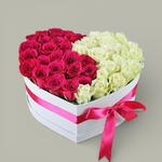 Потрясающая композиция в форме сердца из глубоких красных и кремовых роз, уложенная в элегантную коробку — символизирующая единение страсти и чистоты, два сердца, связанные вечной любовью.
