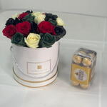 Отпразднуйте элегантность и непреходящую красоту с этим эксклюзивным цветочным произведением — 20 роз премиум-класса насыщенных контрастных оттенков в роскошной черно-золотой дизайнерской коробке вместе с изысканными шоколадными конфетами Ferrero Rocher. Изысканный шедевр, воплощающий изысканность, глубокий смысл и изящество, идеально подходящий для того, чтобы произвести сильное впечатление в любой особенный момент. ✨ Идеально подходит для: корпоративных подарков, роскошных мероприятий, VIP-торжеств, юбилеев или просто сердечных жестов, требующих чего-то особенного.