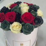Red rose - 5 шт. Box - 1 шт. White rose - 5 шт. черная роза, окрашенная спреем - 5 шт. роза окрашенная в зелёный цвет - 5 шт. коробка из 16 штук ferrero rocher - 1 шт.