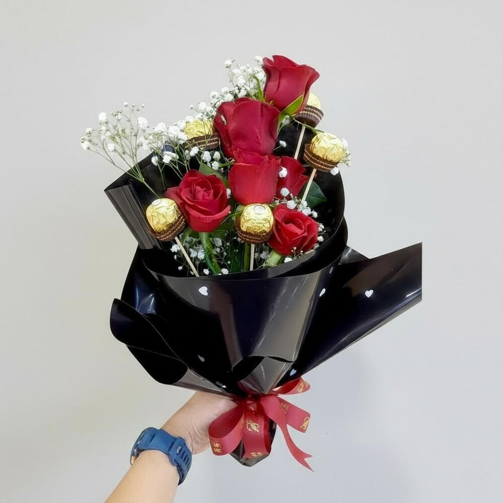 Очаровательное сочетание романтики и сладости: этот букет включает свежие красные розы и конфеты Ferrero Rocher, изысканно оформленные, чтобы стать элегантным и запоминающимся подарком. Упакован в премиальную чёрную бумагу с нежными принтами в виде сердечек и украшен роскошной лентой, этот букет идеально подходит для дней рождения, годовщин или сюрприза для кого‑то особенного. Храните цветы в прохладном, сухом месте, вдали от прямых солнечных лучей и источников тепла. Лёгко опрыскивайте цветы ежедневно. Конфеты храните в сухом, прохладном месте. Избегайте чрезмерного обращения, чтобы сохранить свежесть и презентабельный вид.
