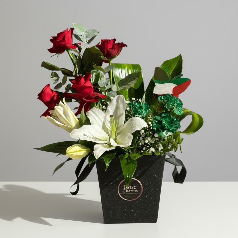 Отпразднуйте Национальный день ОАЭ с Unity in Bloom, изящно выполненной композицией в сумочке, символизирующей гордость и единство. В составе: 3 ярко-зеленые гвоздики, 4 эффектные красные розы и безупречно белая лилия. Композиция элегантно дополнена декоративными наполнителями и бабочкой в цветах флага ОАЭ, что придает патриотичный акцент. Идеально, чтобы уникально и от души почтить дух нации.
