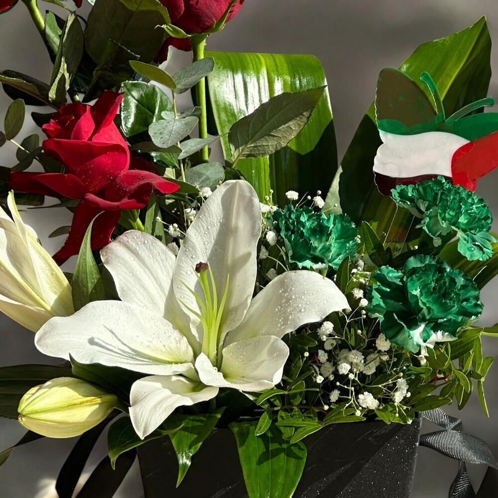 Red rose - 4 шт. Box - 1 шт. green carnation - 3 шт. white lily - 1 шт. бабочка в цветах флага ОАЭ - 1 шт.