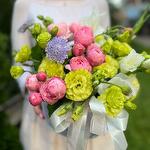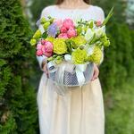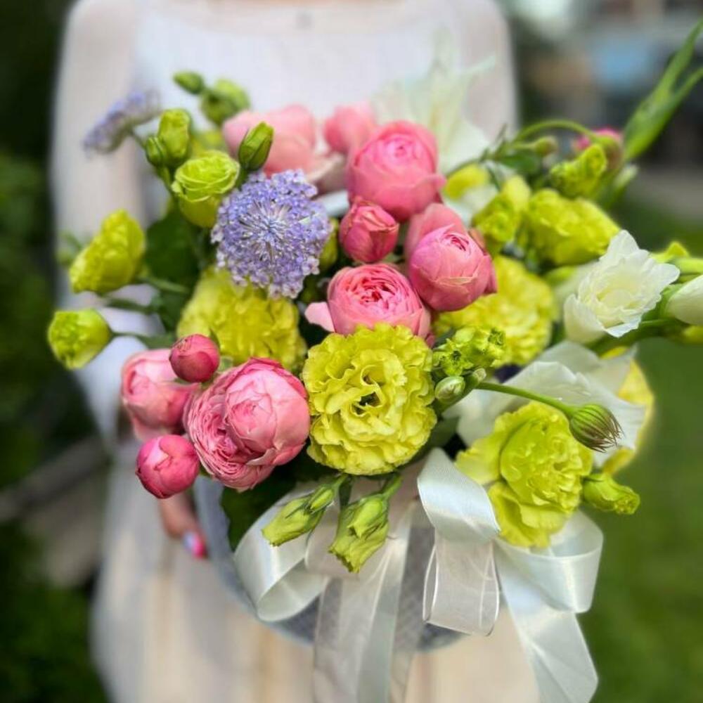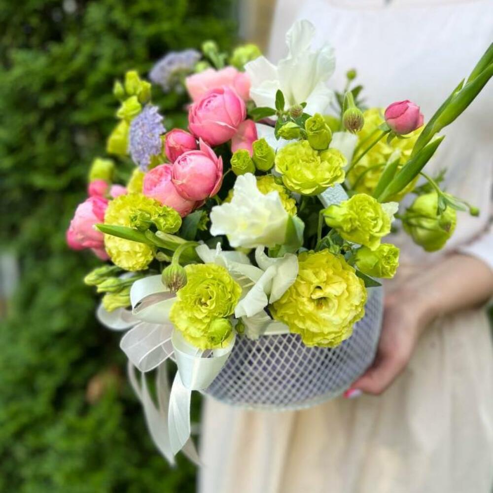 Composition: Gladiolus - 1, Spray Rose Odilia light pink - 2, Lisianthus - 3, Asparagus - 3, basket - 1, ribbon - 2 Sizes: WIDTH - 25CM; HEIGHT - 20CM; LENGTH - 20CM; (including packaging) Размер: 25 x 20 x 20 см