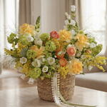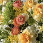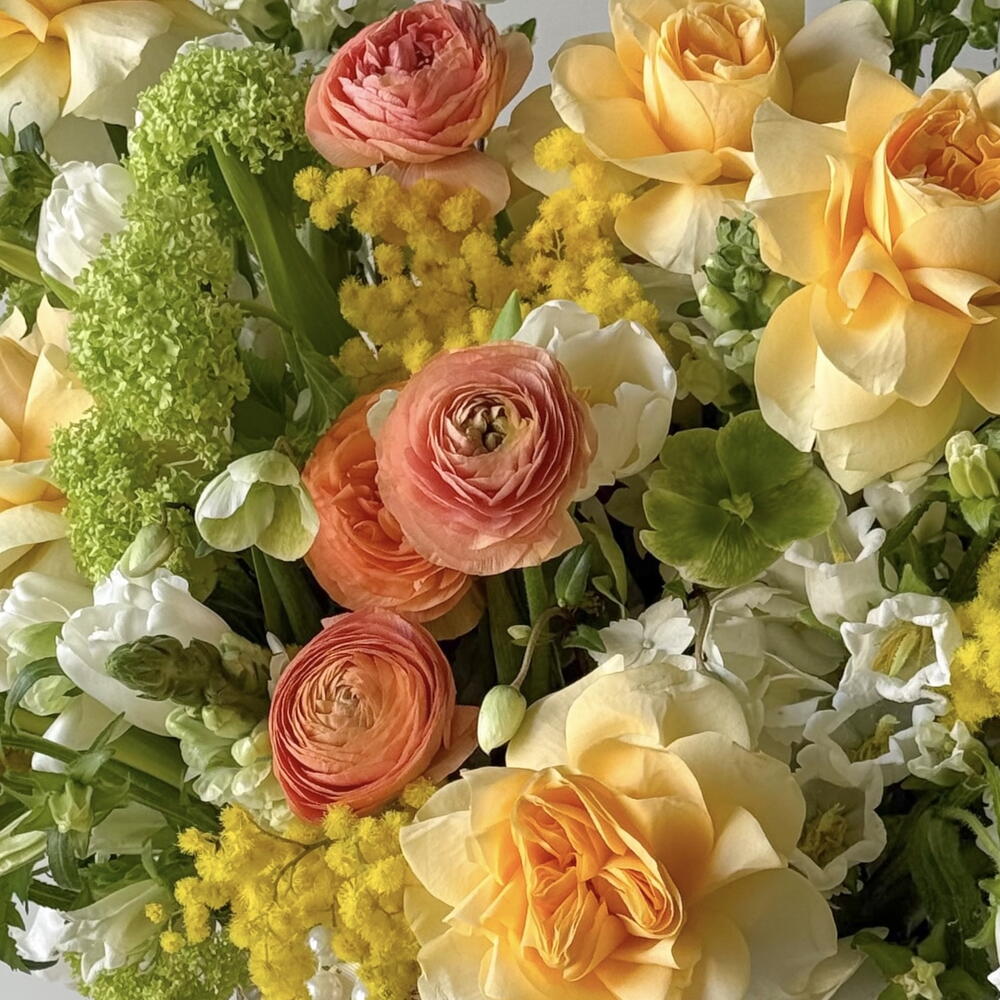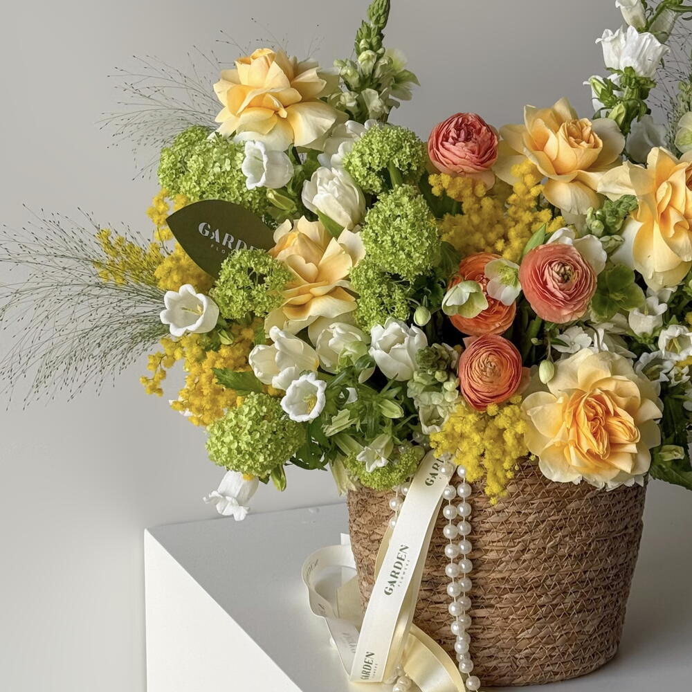 This bright and delicate arrangement for March 8th combines warm shades of yellow, peach, and green. It features roses, ranunculuses, tulips, and mimosa — the perfect choice for a spring gift that will bring joy and a sunny mood to your beloved woman. Includes tulip, ranunculus, viburnum, mimosa, campanula, helleborus, panicum, Buttercup rose. The set comes with a personalized card, care instructions, flower fertilizer. *Flower delivery today Perfect for: - a gift for her; - weddings or anniversaries; - birthday; - perfect dates; - gift add-ons; - International Womens Day; - gifts with no occasion; - VIP events or luxury floral surprise.