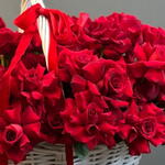 Количество стеблей: 151 ярко-красная роза, каждая отобрана за насыщенный цвет и бархатистую текстуру. Оформление: Розы тщательно уложены в большую элегантную корзину с плетеной ручкой и красиво перевязаны белой лентой.