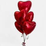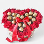 Red rose - 25 шт. Ferrero rocher - 18 шт. Basket - 1 шт. Red ribbon - 1 шт. красные гелиевые шары в форме сердца - 5 шт.