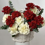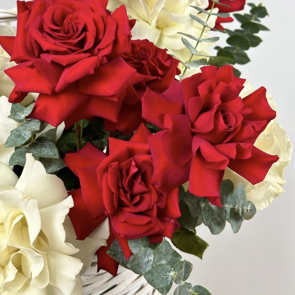 Eucalyptus - 10 шт. Basket - 1 шт. красные классические розы - 26 шт. кремово-белые классические розы - 25 шт.