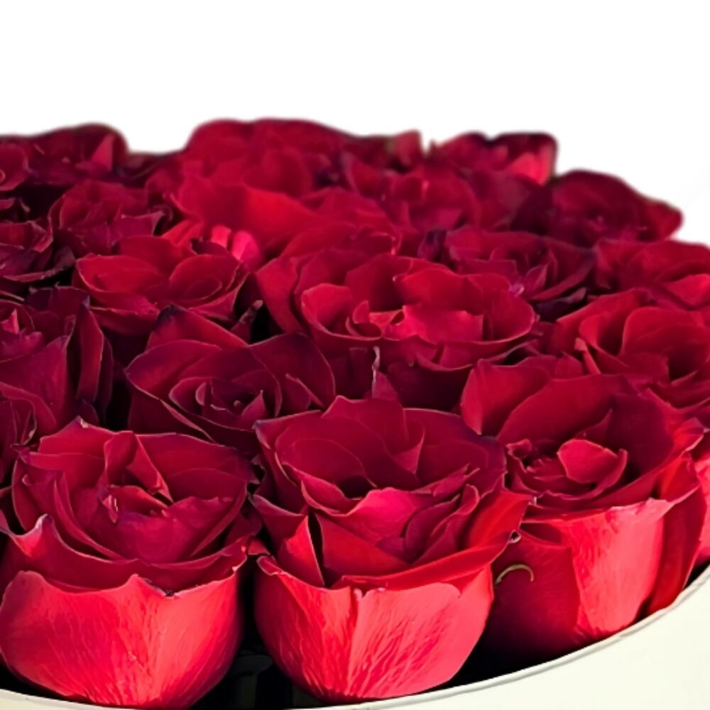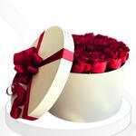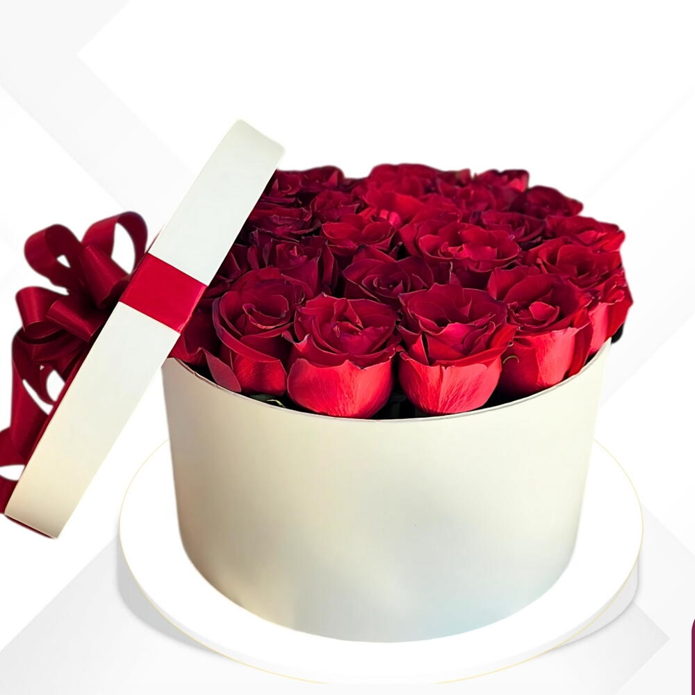 Роскошная белая коробка, содержащая великолепную композицию из красных роз и украшенная красной лентой, символизирующей любовь и элегантность. Подходит для всех особых случаев.