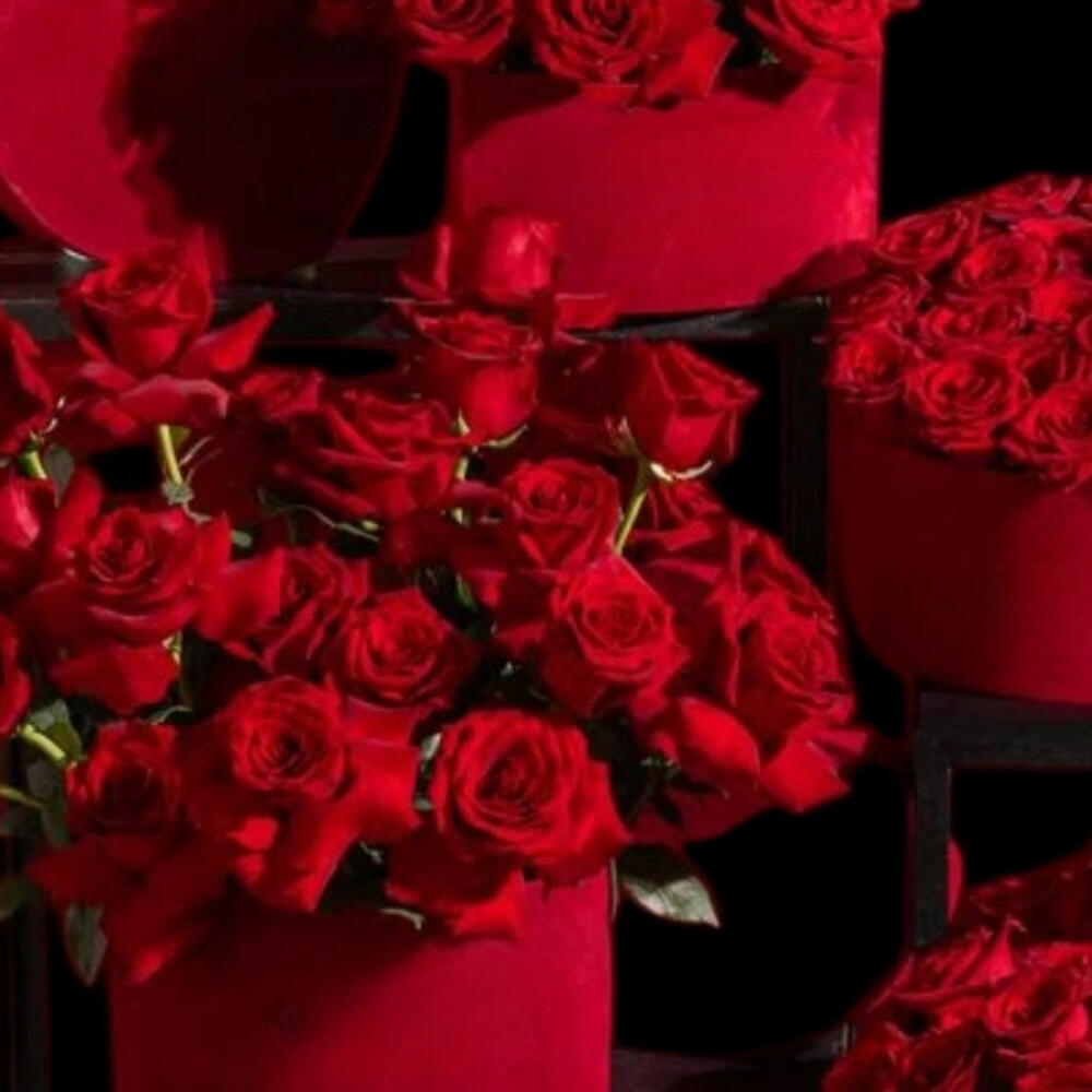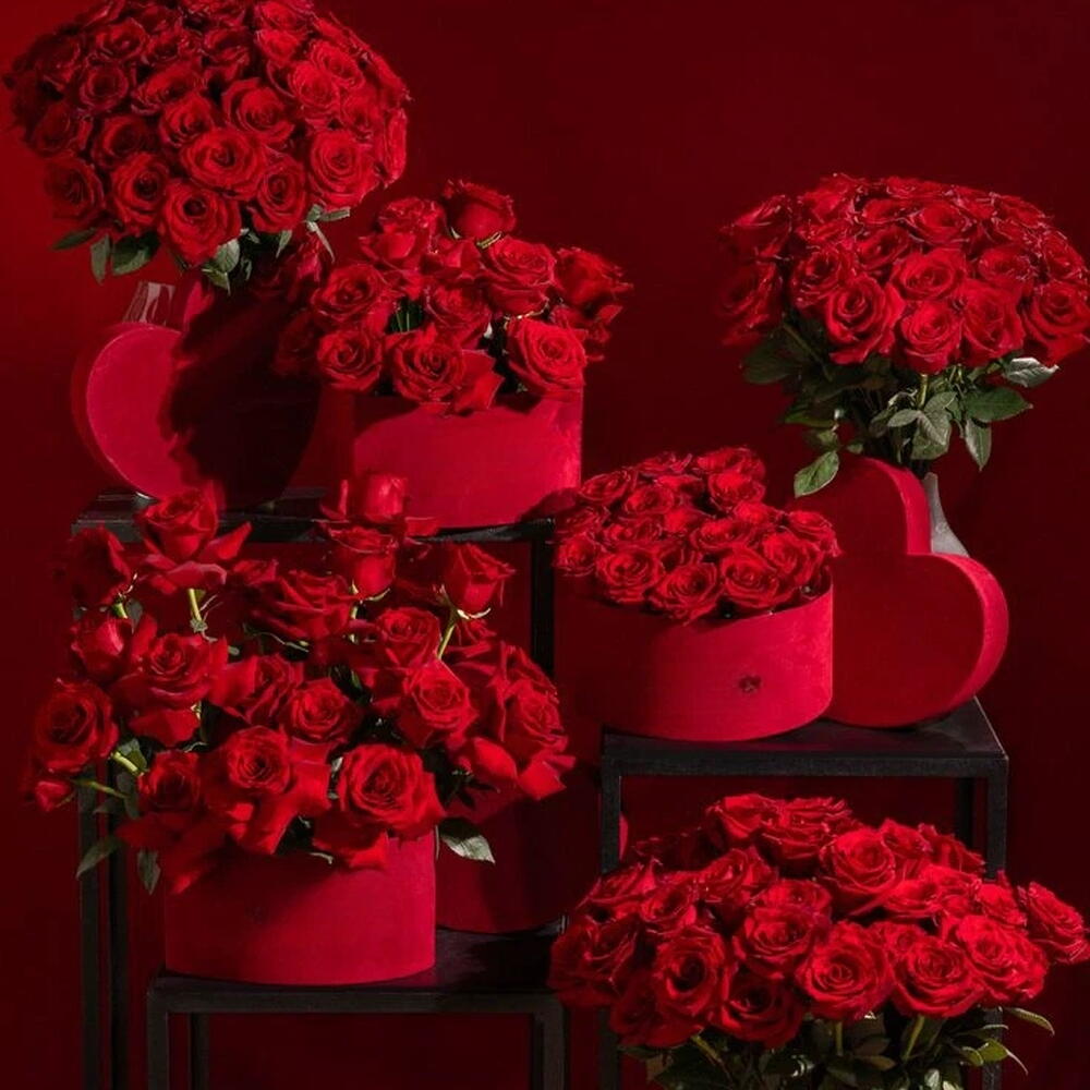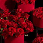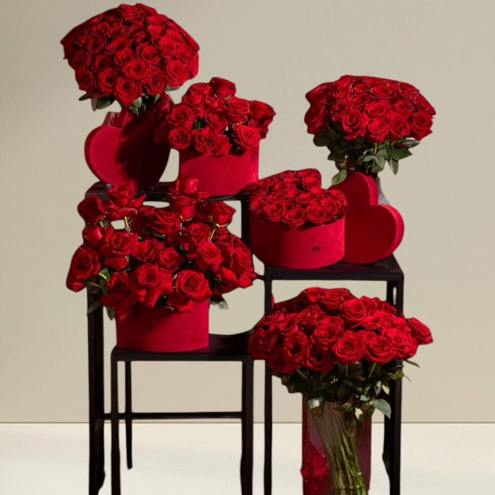 коллекция роскошных композиций с многочисленными яркими 251 красными розами, представленных в различных вариантах: 3 красных в форме сердца, а также 3 в стеклянной вазе.
