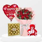 Сделайте этот День святого Валентина незабываемым с нашим эксклюзивным подарочным букетом ко Дню святого Валентина. Удивите и порадуйте любимого человека этим тщательно продуманным букетом: 15 красных роз, изящно упакованных в светло-розовую водонепроницаемую бумагу. Коробка из 25 шоколадных конфет Ferrero Rocher. На фольгированном воздушном шаре в форме сердца написано «С Днём святого Валентина». На красном плюшевом мишке написано «Я люблю тебя» (высота: 30 см). Закажите сейчас и позвольте этому тщательно подобранному подарочному букету ко Дню святого Валентина выразить ваши самые глубокие чувства.
