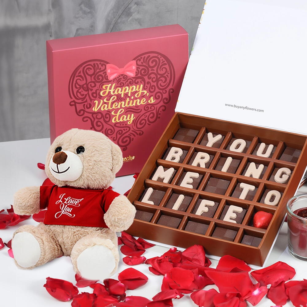 Мишка «Я люблю тебя» 25 см, бренд — Sweecho, текст — «Ты оживляешь меня», тип — молочный шоколад, количество — 25 шт., разные вкусы — фисташки, чизкейк, лотос, фундук, кофе, кукурузные хлопья, смесь орехов, аллергены — орехи и молоко, упаковано в красивую подарочную коробку ко дню Святого Валентина.