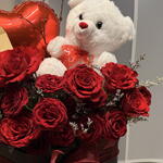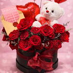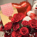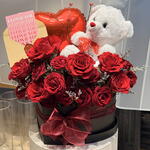 Teddy bear - 1 шт. heart shaped box - 1 шт. heart balloon - 1 шт. лимониум - 10 шт. roses - 15 шт. valentine card - 1 шт.