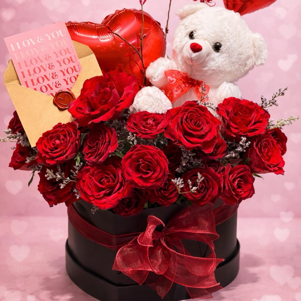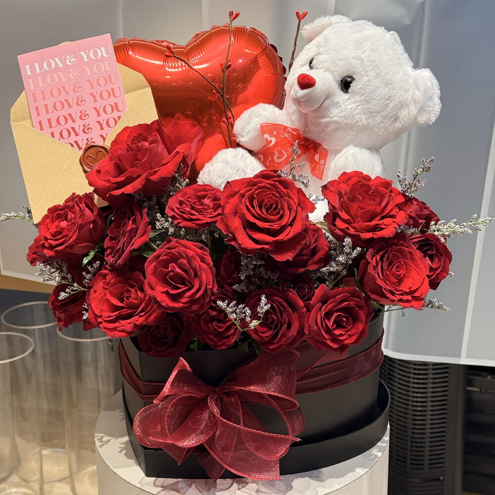 Teddy bear - 1 шт. heart shaped box - 1 шт. heart balloon - 1 шт. лимониум - 10 шт. roses - 15 шт. valentine card - 1 шт.