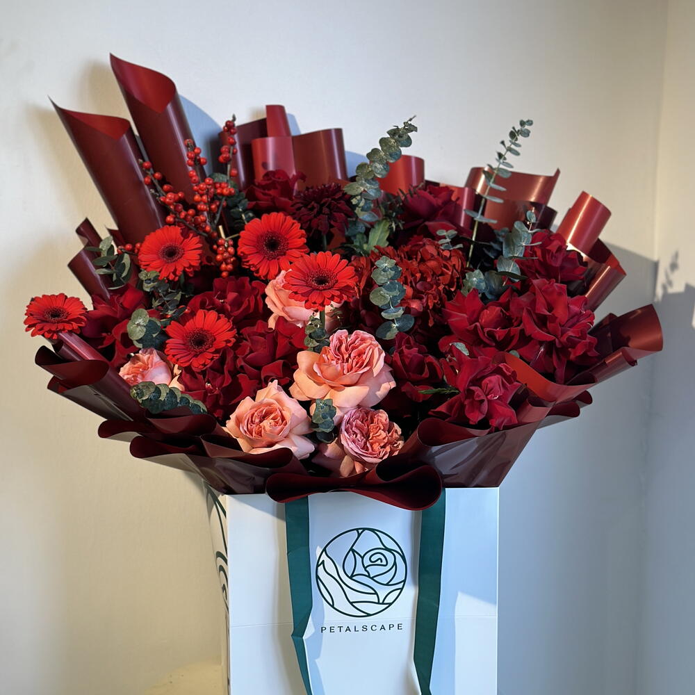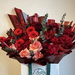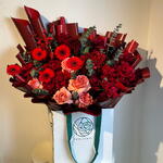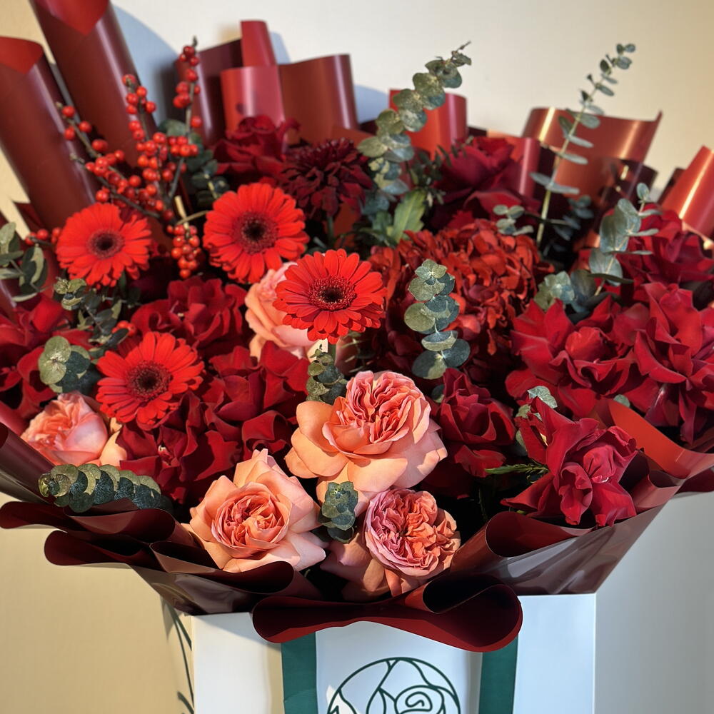 Eucalyptus - 8 шт. Gerbera - 5 шт. гиперикум красный - 2 шт. красная гортензия - 1 шт. red roses - 10 шт. розы Джульетта - 5 шт.