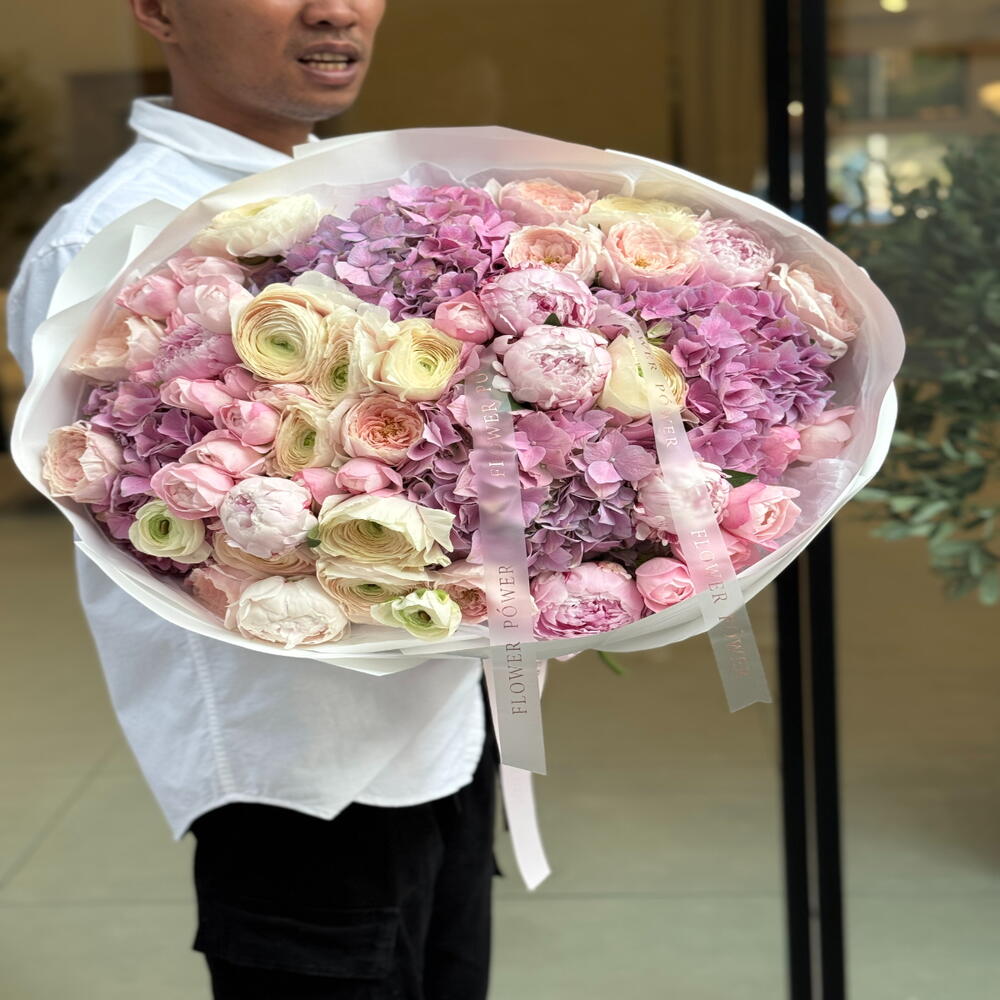 4 Hydrangea Pink and Purple, 10 Rose ohara pink, 8 Peony Sarah, 10 Ranunculus Super light pink, 7 Rose spray strawberry pie. Designed in a premium L bouquet style (40–50 cm) with elegant wrapping and ribbon finish.