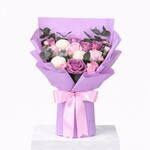 Фиолетовые розы, смешанные с розовыми розами и эвкалиптом — мягкий контраст, ароматно. Фиолетовая роза 5 стеблей, Светло-розовая роза 5 стеблей, Пингпонг 3 стебля, Розовая спрей-гвоздика 3 стебля, Эвкалипт 3 стебля
