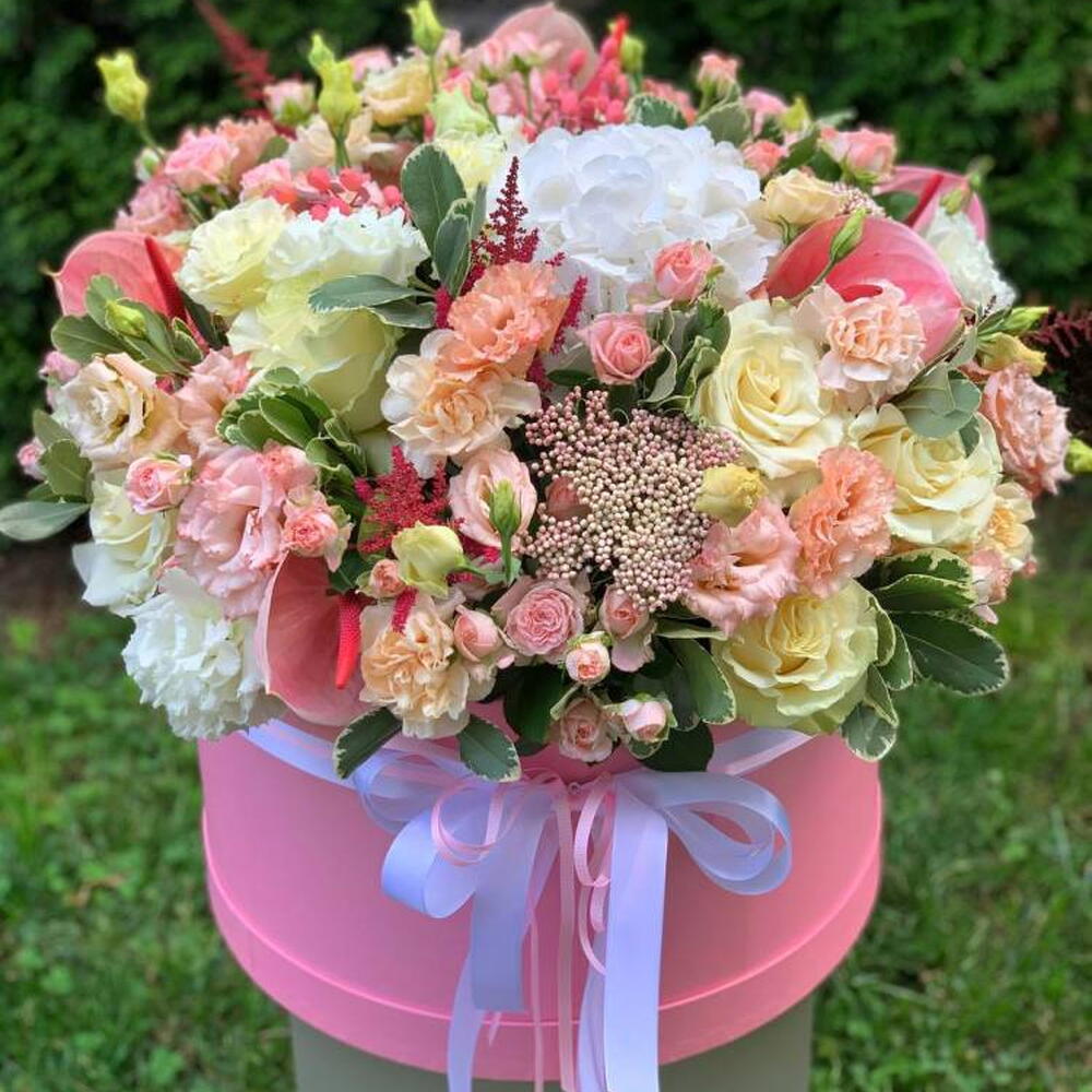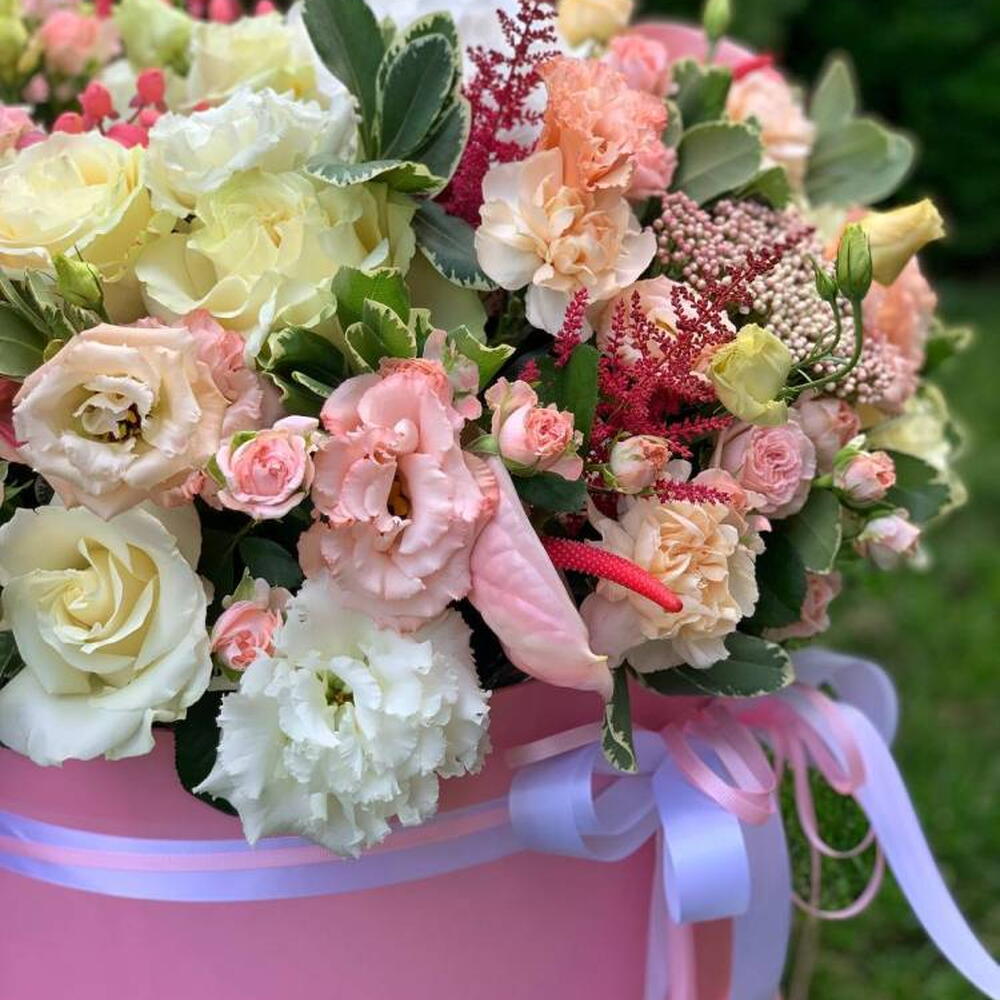 Composition: Anthurium - 5, Hydrangea - 3, Astilbe - 5, Rose Mondial - 15, Dianthus - 11, Ozothamnus - 3, Lisianthus - 10, Rose sprey Madame Bombastic - 10, Hypericum - 3, Pittosporum - 8, box - 1, ribbon - 2 Sizes: WIDTH - 50CM; HEIGHT - 50CM; LENGTH - 50CM; (including packaging) Размер: 50 x 50 x 50 см