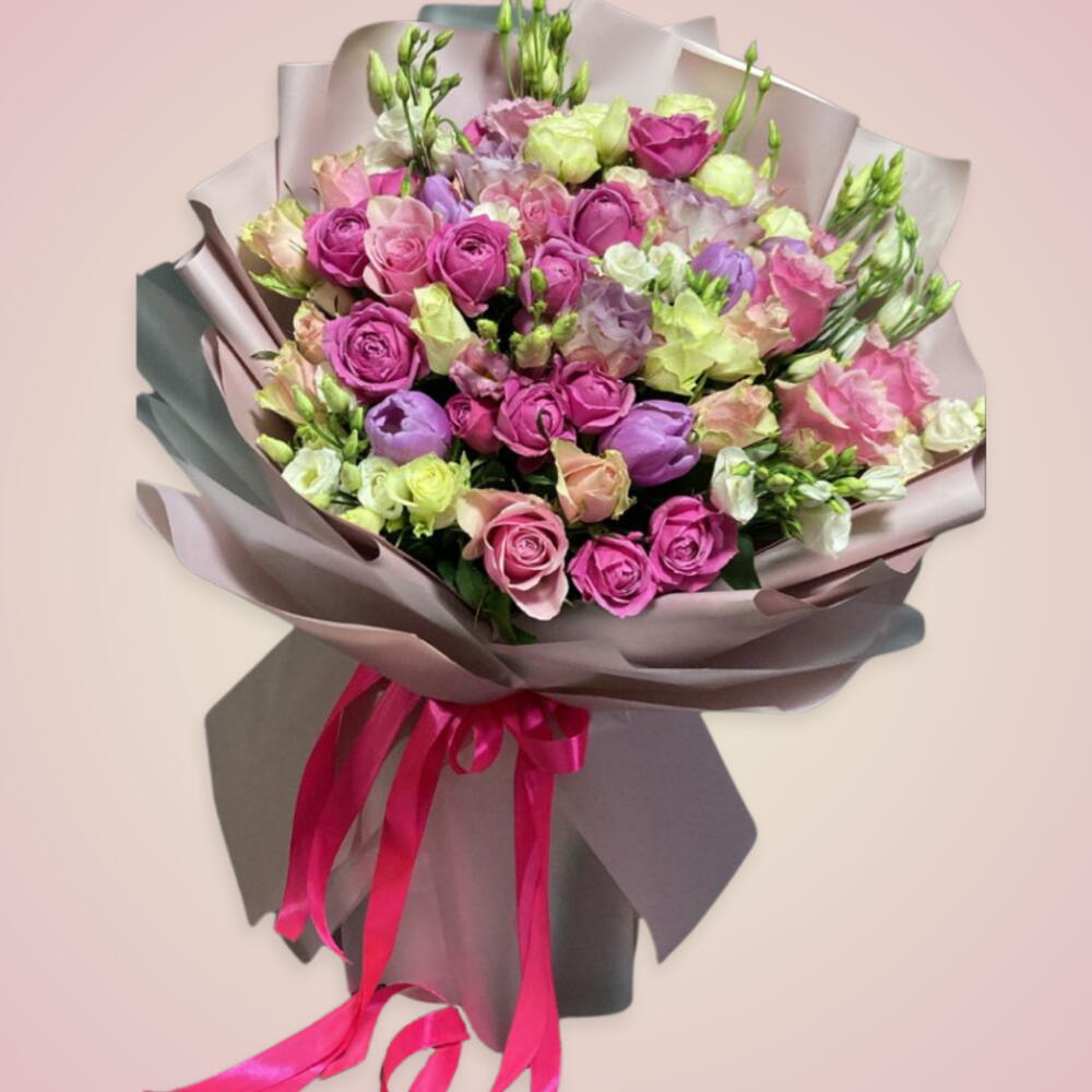 5 фуксиевых мини-роз, 7 персиковых лизиантусов , 5 фиолетовых роз, 5 розовых роз,