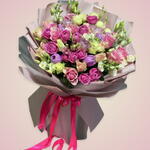 Pink rose - 1 шт. purple rose - 1 шт. персиковая эустома - 7 шт. фуксиново-розовая мини-роза - 5 шт.