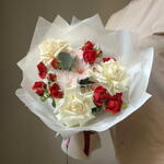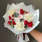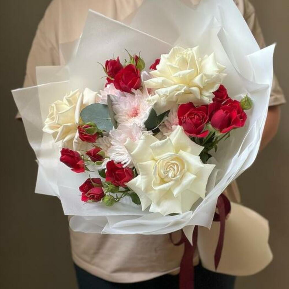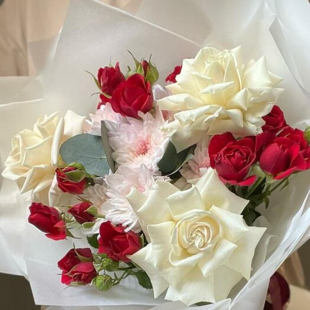 Spray rose - 3 шт. Chrysanthemum - 1 шт. packaging - 1 шт. euclyptus - 1 шт. французская белая роза - 3 шт.