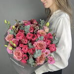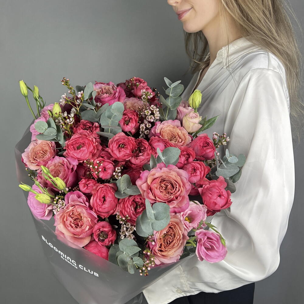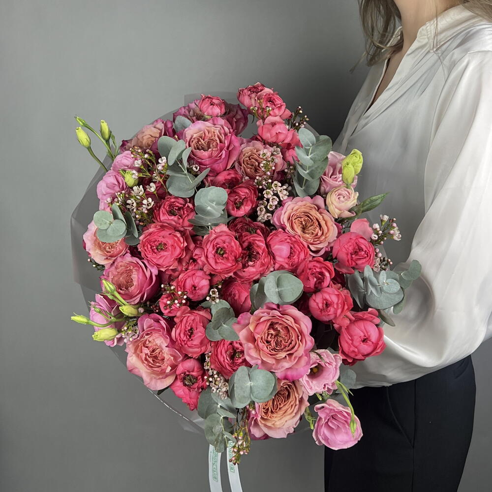 Сочетание розовых оттенков создаёт успокаивающую, романтичную атмосферу, идеально подходящую для выражения любви или восхищения. Роза Miyabi и спрей-розы занимают центральное место, тогда как лизиантус и восковые цветы добавляют слои очарования. Эвкалипт связывает всё воедино своим свежим, чистым ароматом.