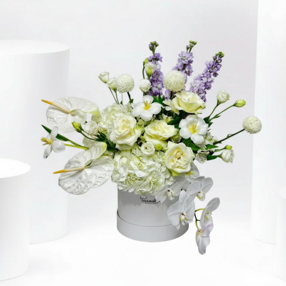 Hydrangea - 2 шт. Антуриум - 2 шт. Tulip - 3 шт. rose - 5 шт. ping pong - 3 шт. лизиантус - 4 шт. метиона - 3 шт. белая альстромерия - 2 шт. пар белой орхидеи - 1 шт.
