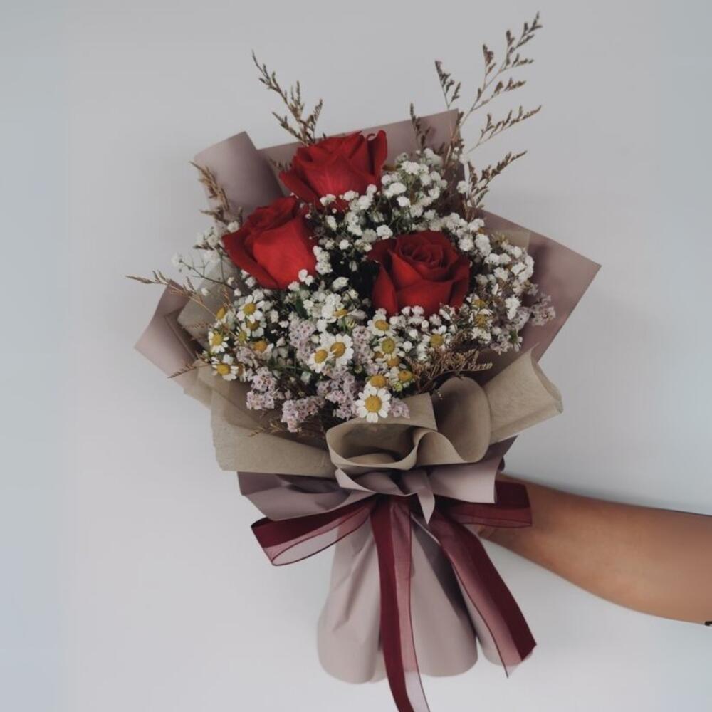 Очаровательный букет из 3 классических красных роз, дополненный нежной ромашкой и гипсофилой в качестве наполнителей. Милый и элегантный подарок, символизирующий любовь, заботу и внимательную привязанность—идеально подходит для дней рождения, юбилеев или романтических сюрпризов