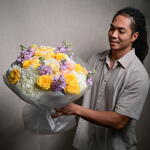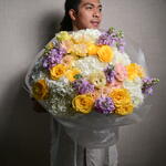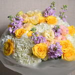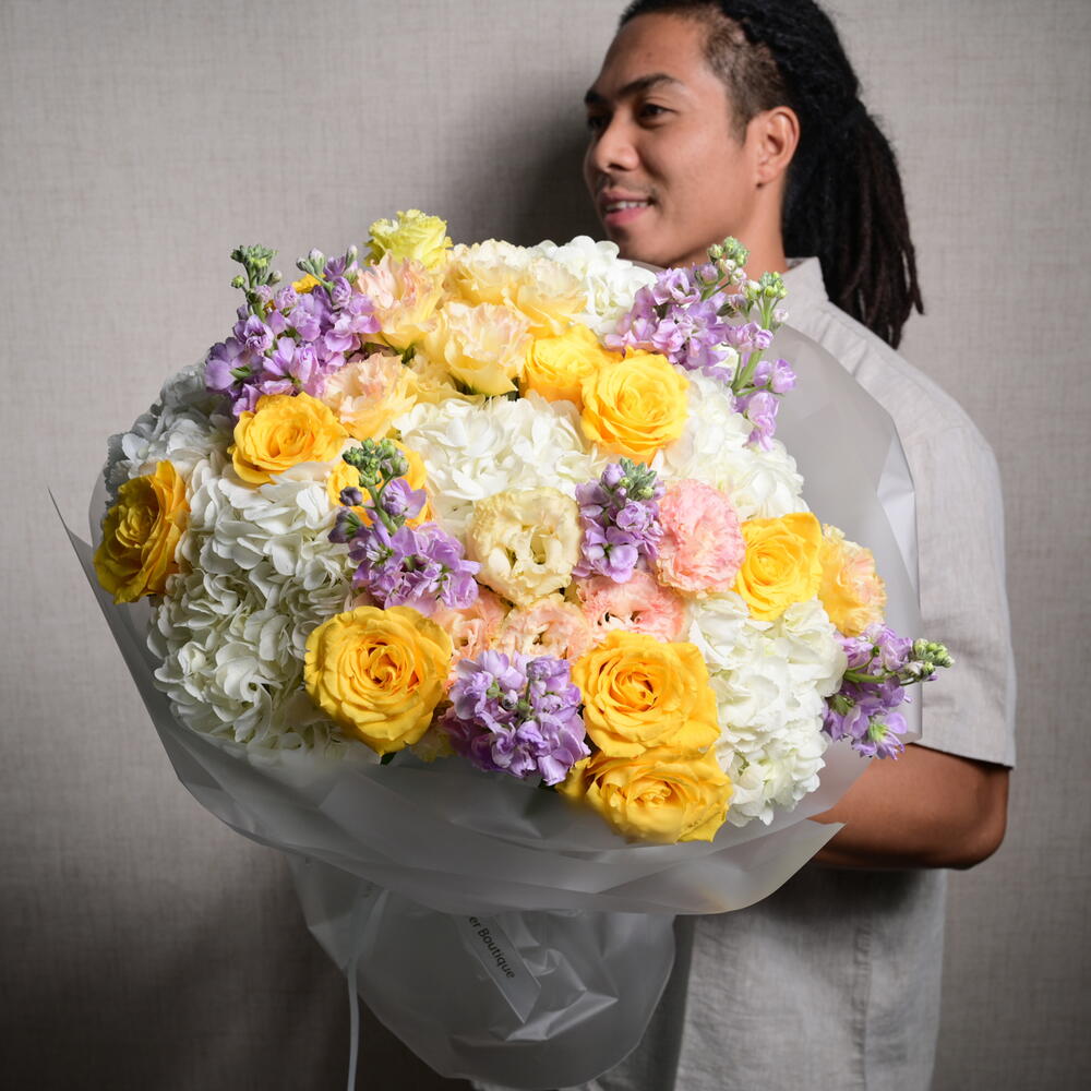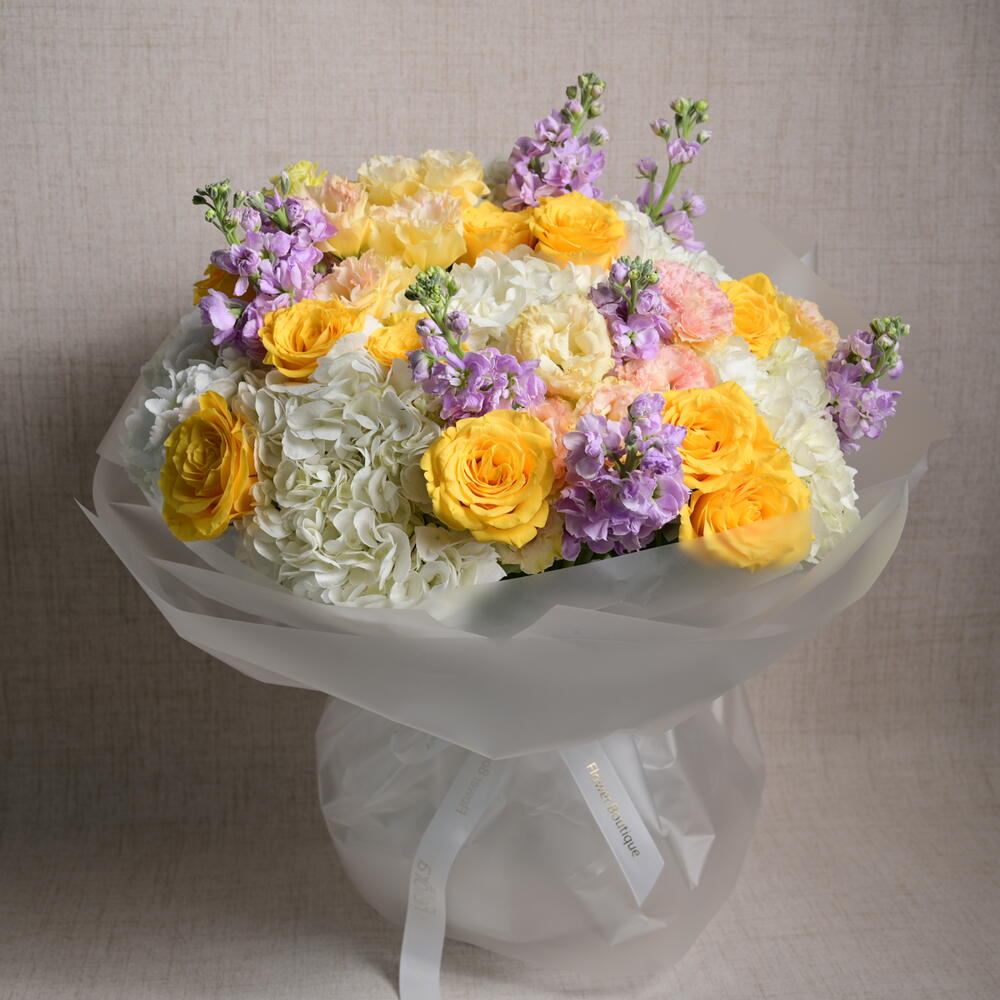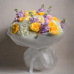 Изысканная цветочная композиция из 6 гортензий, 9 маттиол, 11 роз и 6 эустом, элегантно объединённых для создания вневременного и изящного букета, идеального для любого случая.