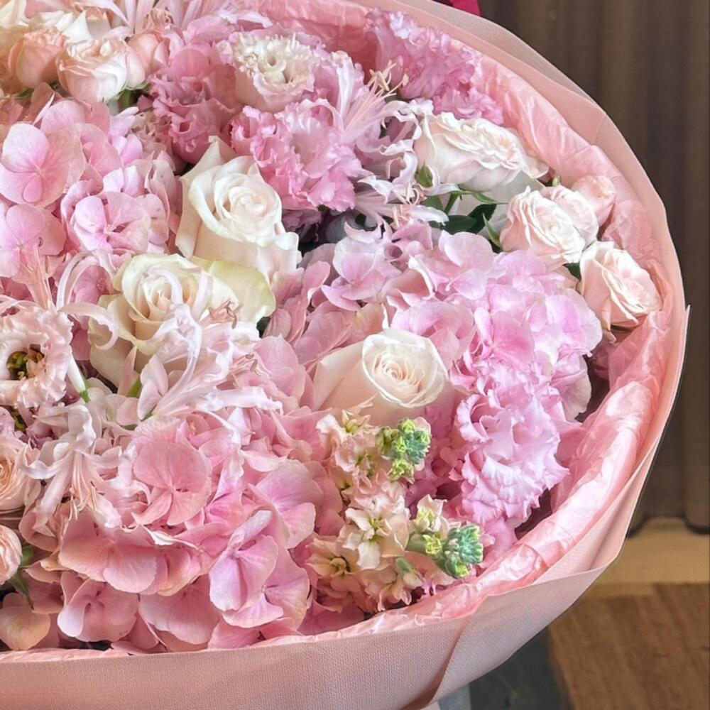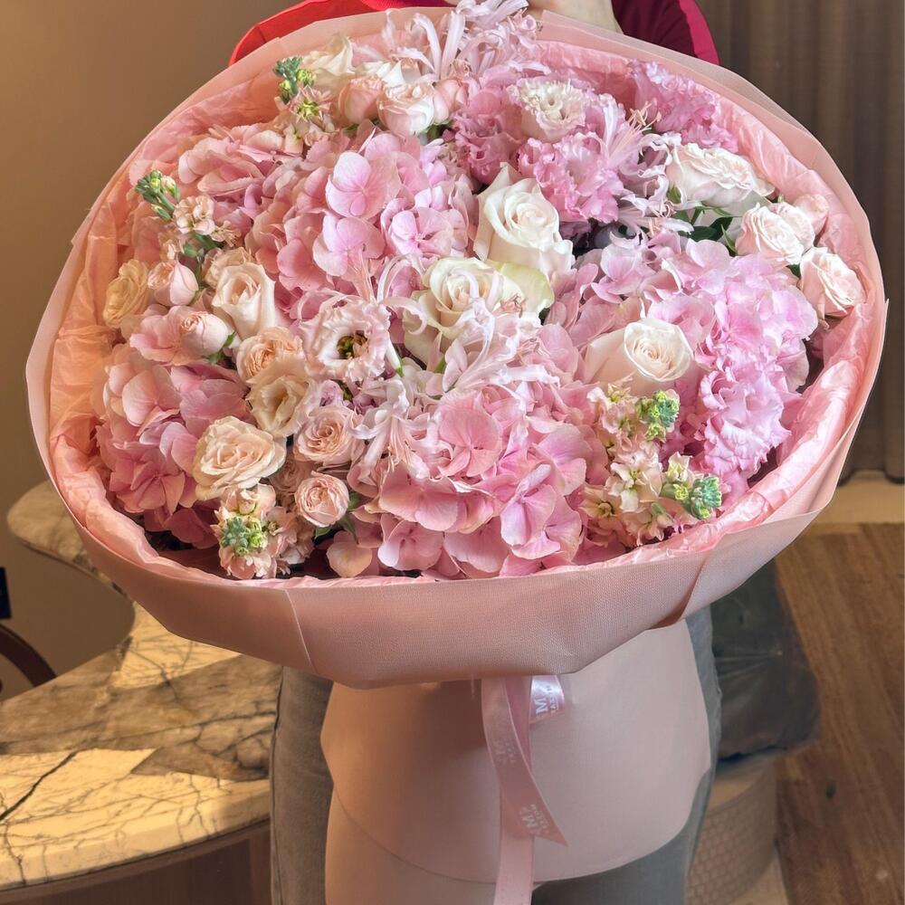 Добавить в корзину Роскошный букет, связанный вручную, из нежно-розовых гортензий, премиальных роз и изящных сезонных цветов, красиво упакованный в фирменном роскошном стиле Majd flower. Carmen — женственная, элегантная и полная очарования — потрясающий выбор для дней рождения, годовщин, вечеринок в честь будущего малыша или просто как романтический сюрприз