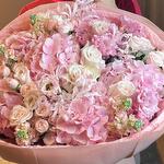 lisianthus pink - 6 шт. pink hydrangea - 5 шт. white roses - 10 шт. нежно-розовые спрей-розы - 20 шт. нежно-розовые гвоздики - 5 шт. narine лилии - 5 шт.
