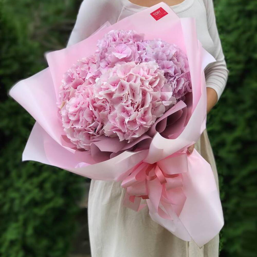 Composition: Hydrangea - 5, Wrapped - 5, Ribbon - 3 Sizes: WIDTH - 40CM; HEIGHT - 50CM; LENGTH - 50CM; (including packaging) Размер: 40 x 50 x 50 см