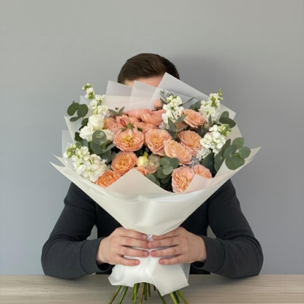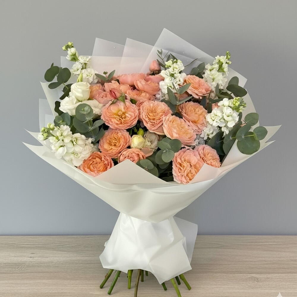 Нежная композиция из 10 белых маттиол и 7 кустовых роз персикового оттенка, мягкая, женственная и продуманно составленная, чтобы шептать элегантность в каждом цветке, с листьями эвкалипта.