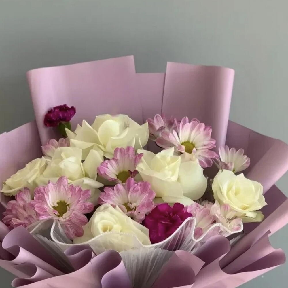 На изображении показан изящный букет нежных фиолетовых и белых цветов, оформленный в мягкой лавандовой гамме. В букете белые розы и розово-фиолетовые хризантемы. Упаковочная бумага сплошного фиолетового цвета с мятым узором внизу, а в центре завязана белая лента бантом. Сочетание белых и фиолетовых цветов может иметь символическое значение. Белые розы могут означать невинность и чистоту, тогда как фиолетовые цветы часто ассоциируются с достоинством, гордостью и успехом. Розовые хризантемы, которые являются частью этого букета, также могут означать честь и любовь.