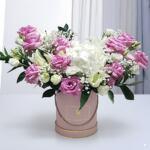 white lilly - 3 шт. white hydrangea - 1 шт. зелёный фильтр - 4 шт. лизиантус - 4 шт. pink roses - 10 шт.