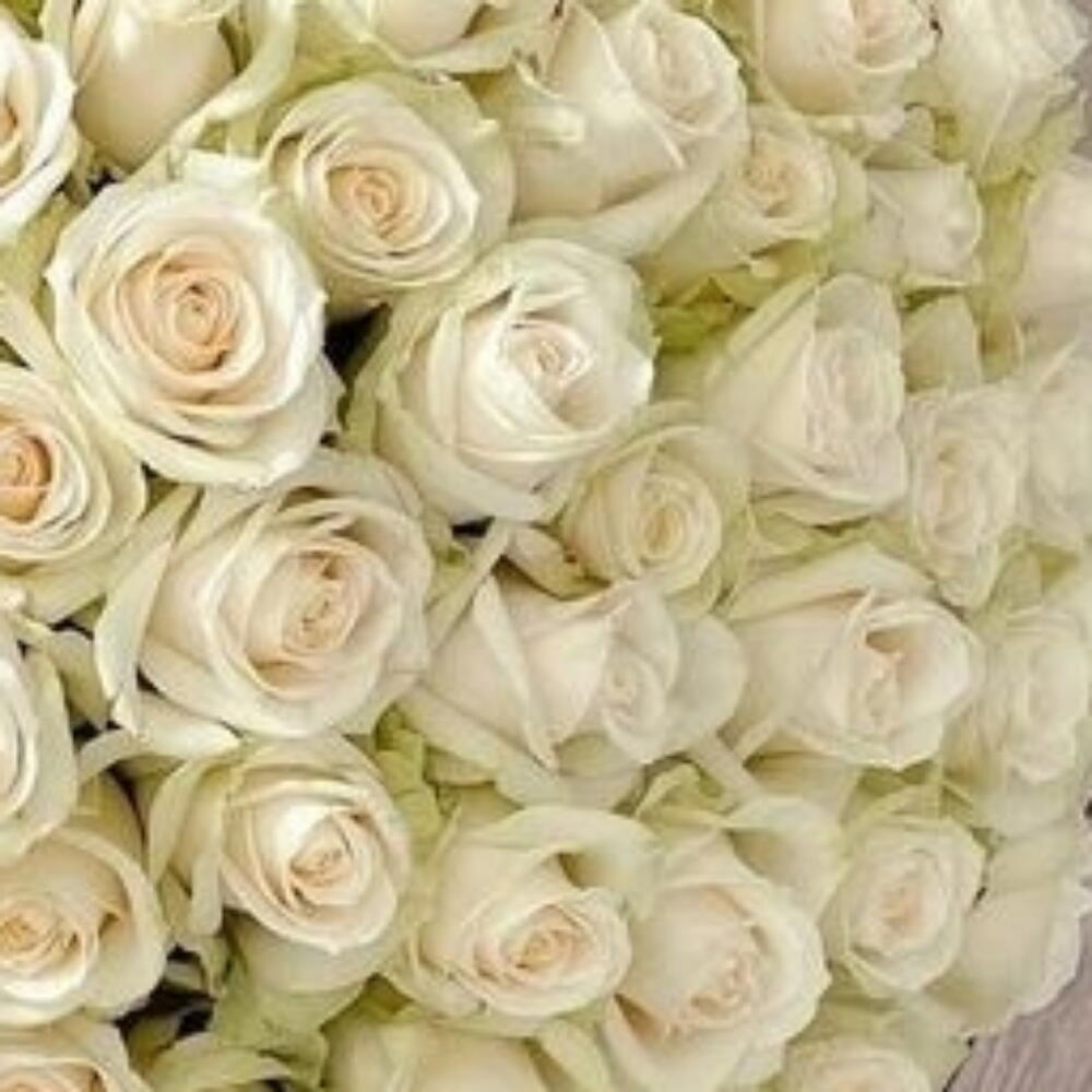 Белые розы символизируют чистоту, невинность и новые начинания. У них нежные, мягкие лепестки, которые часто спирально расходятся от центра в симметричном узоре. Их аромат обычно лёгкий и свежий, иногда с ноткой сладости. Белые розы могут варьироваться от кремового оттенка слоновой кости до чистого, ярко-белого, а их зелёные стебли и листья создают красивый контраст. Эти розы часто используют на свадьбах, похоронах и в особых случаях, символизируя любовь, память и уважение.