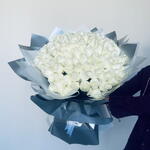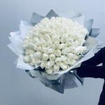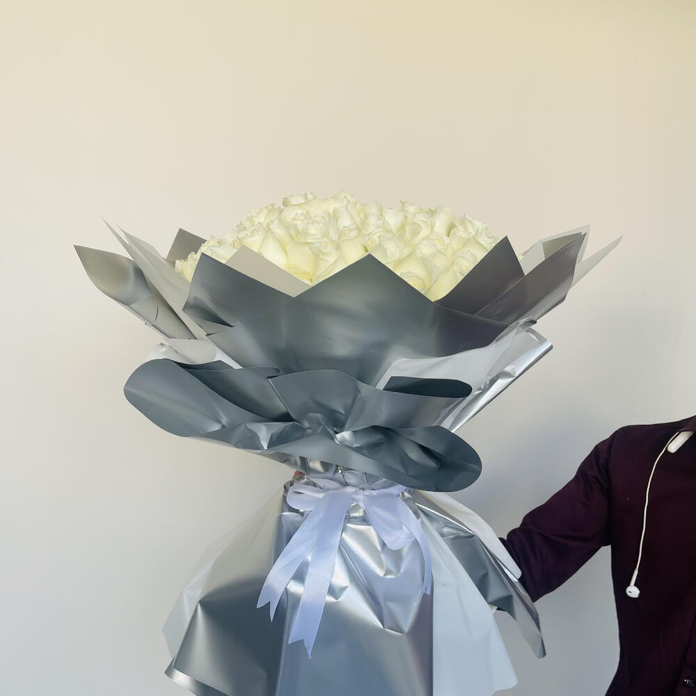 Очаруйте чувства изысканным букетом, специально подобранным нашими опытными флористами. Эта неподвластная времени композиция состоит из 101 воздушной белой розы, считающейся символом невинности и чистоты. Каждая роза тщательно отобрана вручную, чтобы создать роскошное украшение, которое привлечет всеобщее внимание. Букет элегантно упакован в 10 листов мерцающей серебристой бумаги, подчеркивающих естественную красоту и изысканность роз. Наши флористы завершают композицию двумя изящно обвязанными вокруг букета белыми лентами, придавая ему нотку очарования и изящества. Этот изысканно составленный букет обязательно сделает любое торжество незабываемым.