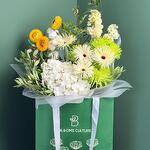 Этот связанный вручную букет — красивое и свежее сочетание белых, зелёных и жёлтых цветов. Ядром букета является крупная, пышная белая гортензия, окружённая ассортиментом ярких гербер как белого, так и уникального светло-зелёного оттенка. Композиция дополнена яркими, игольчатыми зелёными хризантемами и небольшими жёлтыми цветочками в виде пуговиц, что создаёт богатую фактуру. Упакованный в стильную бумагу с логотипом Blooms Culture, он идеальный подарок, чтобы передать радость, чистоту и признательность.