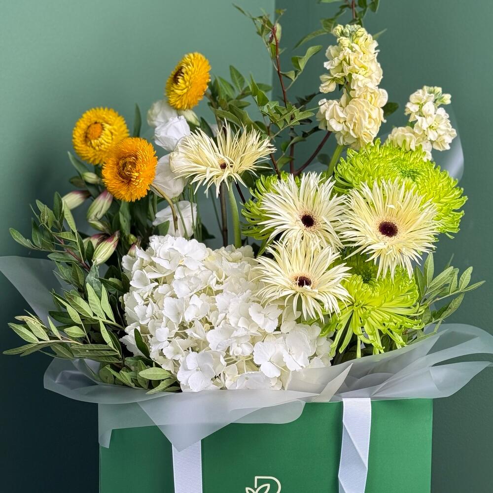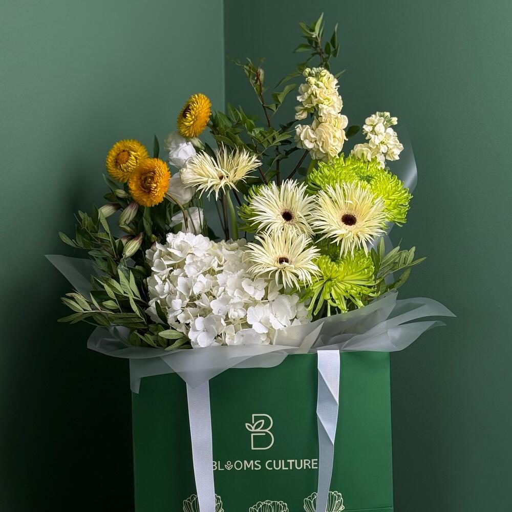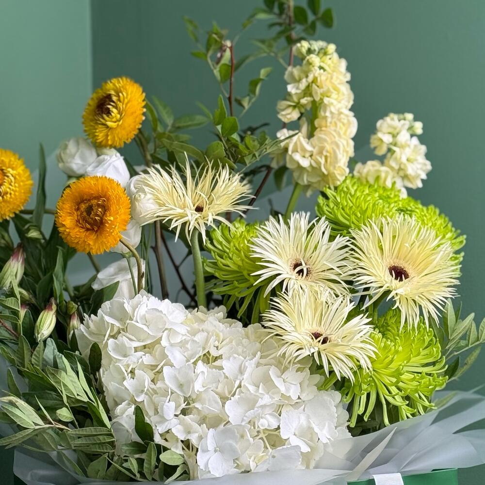 Этот связанный вручную букет — красивое и свежее сочетание белых, зелёных и жёлтых цветов. Ядром букета является крупная, пышная белая гортензия, окружённая ассортиментом ярких гербер как белого, так и уникального светло-зелёного оттенка. Композиция дополнена яркими, игольчатыми зелёными хризантемами и небольшими жёлтыми цветочками в виде пуговиц, что создаёт богатую фактуру. Упакованный в стильную бумагу с логотипом Blooms Culture, он идеальный подарок, чтобы передать радость, чистоту и признательность.