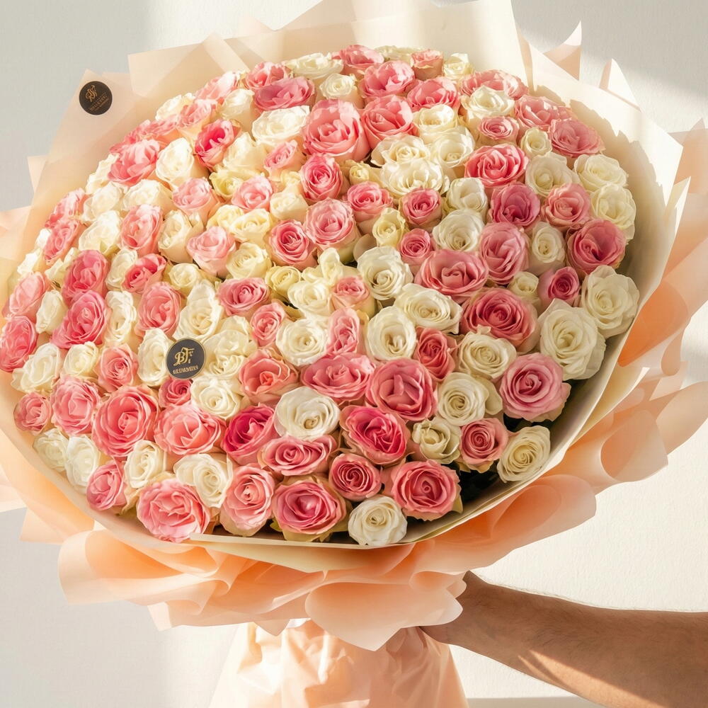 Большой букет из белых и розовых роз 🌸🤍 Потрясающий крупный букет, представляющий собой элегантное сочетание свежих белых и нежно-розовых роз, искусно составленный вручную для создания вневременного и романтического образа. Упакованный в роскошную бумагу и отделанный изысканными деталями, этот букет идеально подходит для свадеб, юбилеев, дней рождения и других торжественных случаев. ✔️ Премиальные свежие розы ✔️ Элегантная гармония белого и розового цветов ✔️ Большой, пышный букет ✔️ Создан вручную профессиональными флористами 📍 Дизайн: Bella Fiora 🚚 Возможна доставка в тот же день