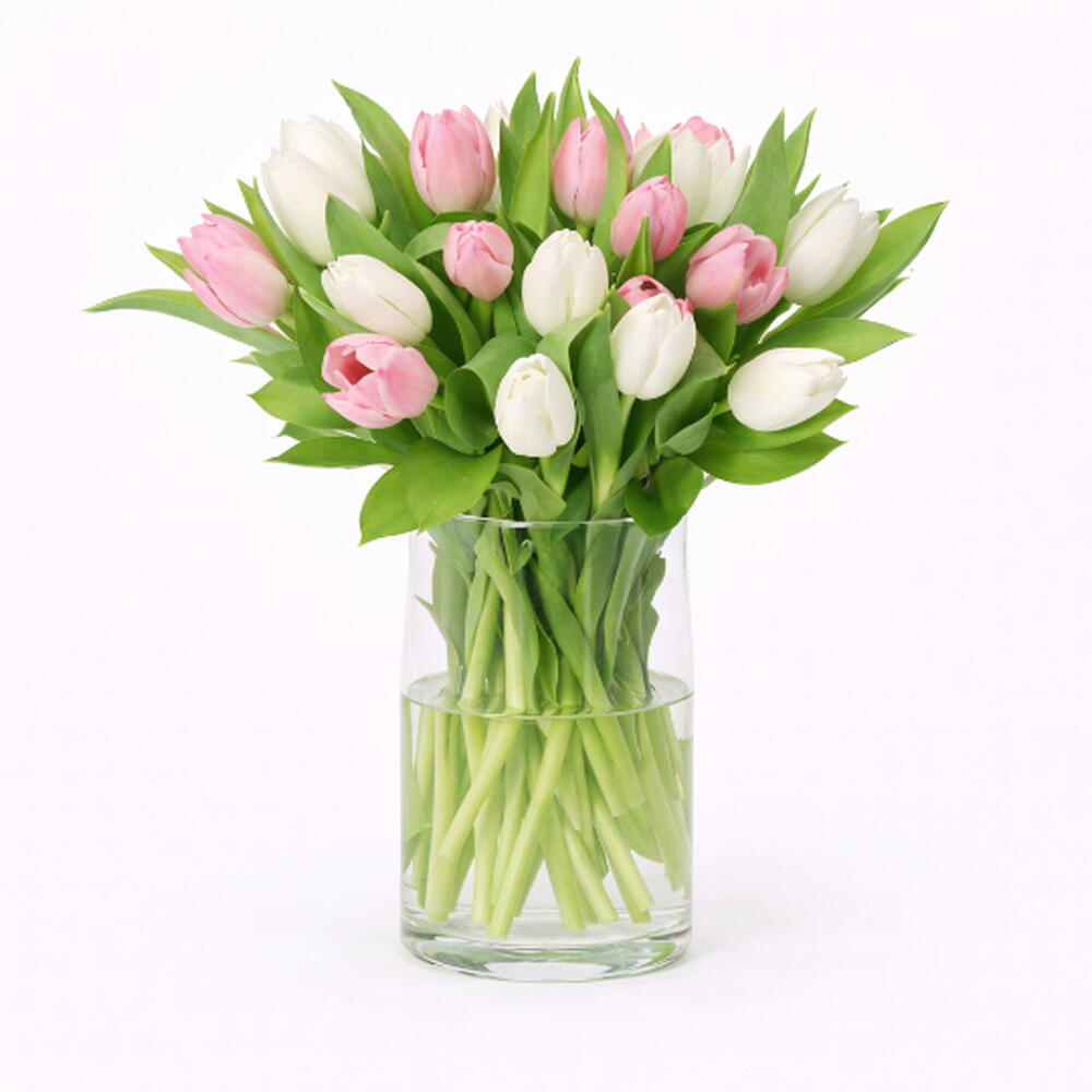 Цилиндрическая ваза с белыми и розовыми тюльпанами