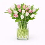 pink tulips - 11 шт. white tulips - 10 шт. прозрачная стеклянная ваза - 1 шт.