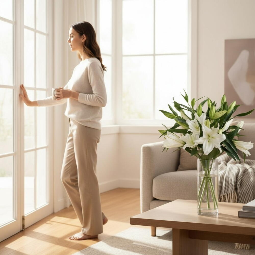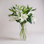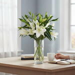Композиция «Белая аура», излучающая спокойствие и тихую элегантность, состоит из 5 белоснежных лилий, расположенных в изящной вазе, создавая безмятежную и утонченную картину. Идеально подходит для трогательных жестов, создания спокойной атмосферы или важных событий, эта композиция воплощает в себе суть изящества и простоты. Это вневременной подарок, который говорит мягко, но красиво.