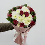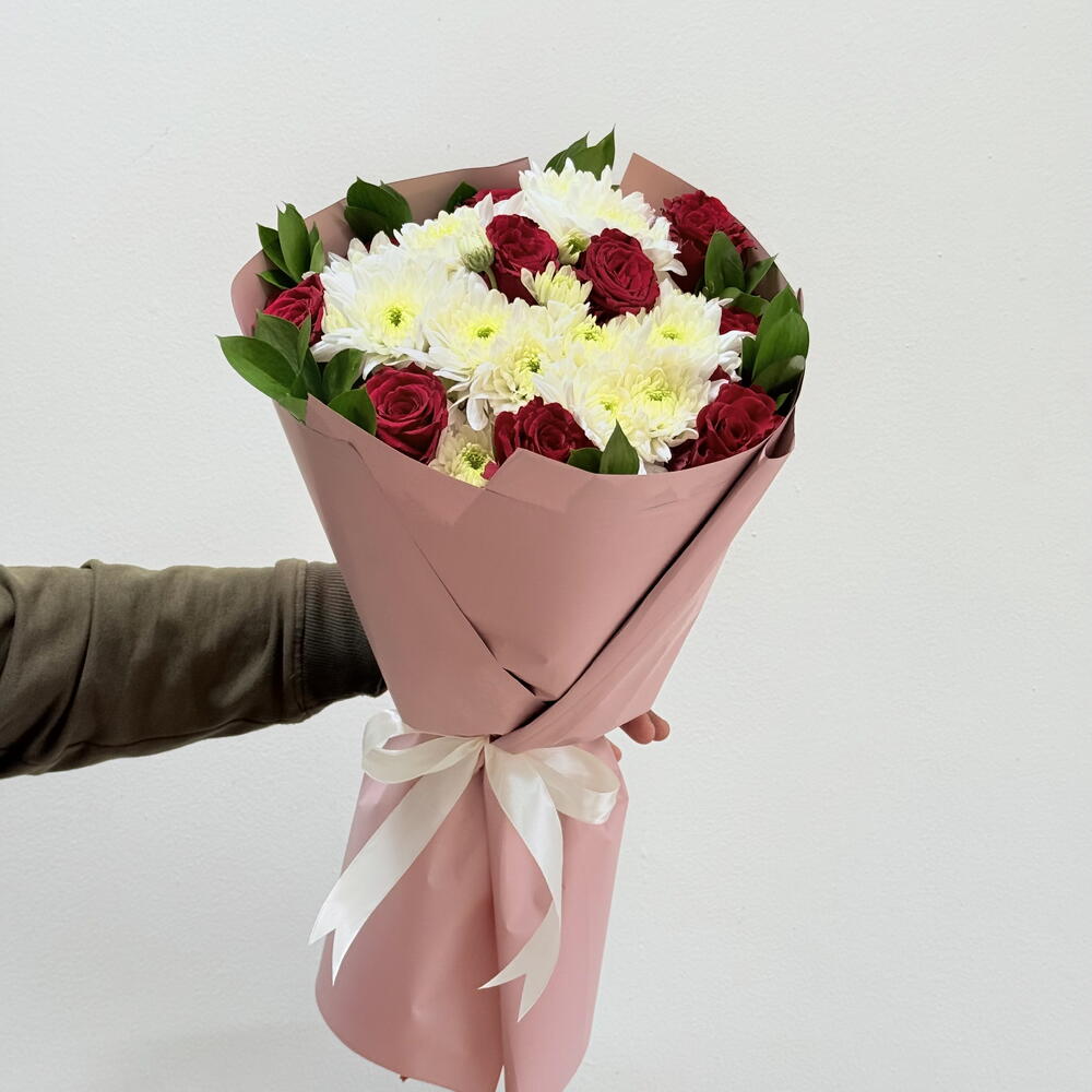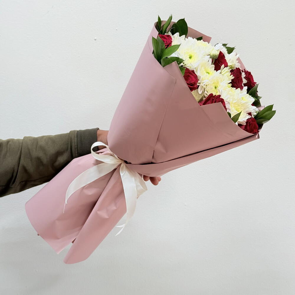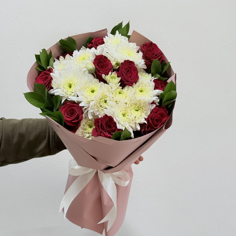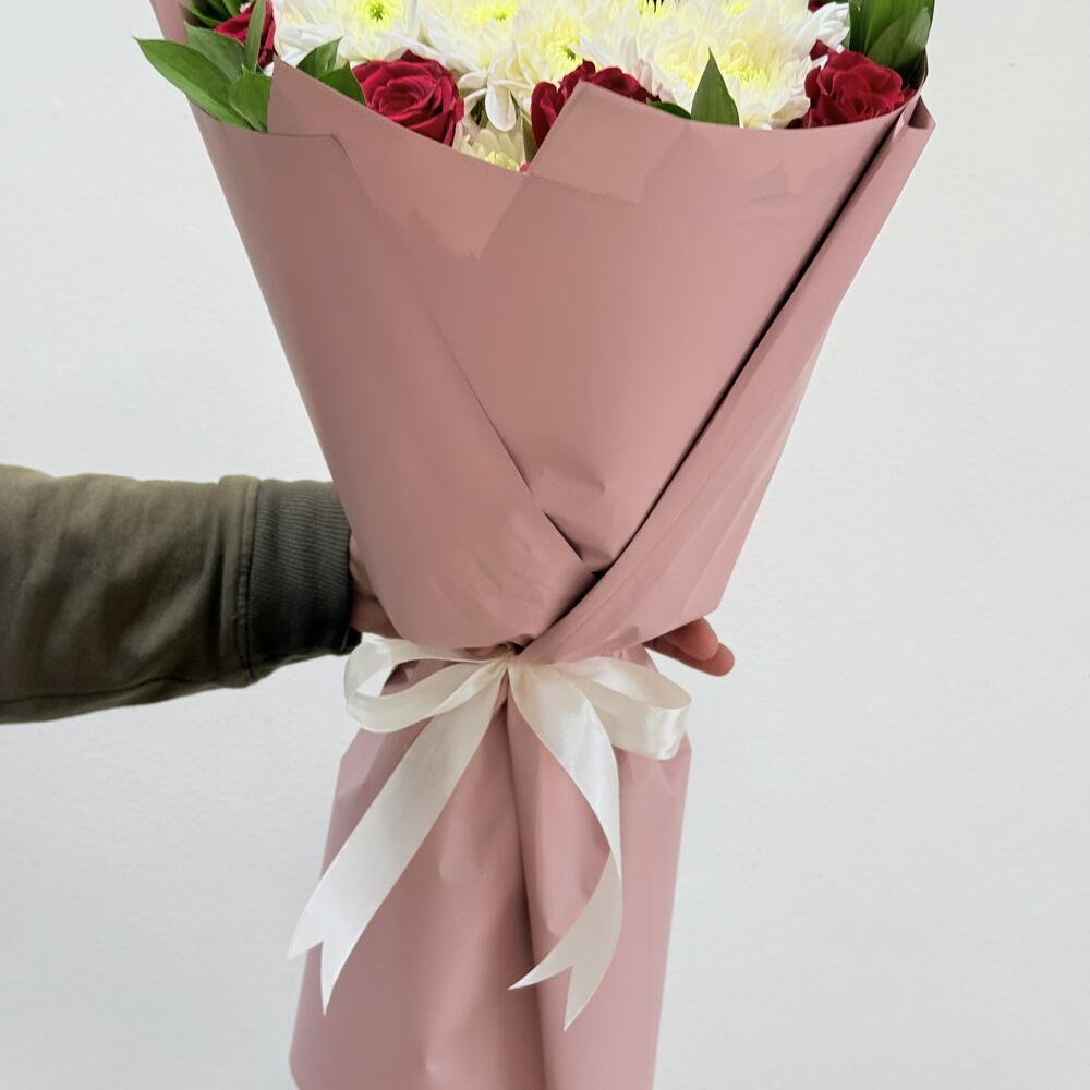 Ribbon - 1 шт. Chrysanthemum - 5 шт. wrapping paper - 5 шт. листья рускуса Колумбия 60 см - 10 шт. red roses - 10 шт.