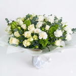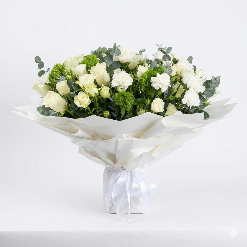 This bouquet is a stunning example of classic elegance with a modern, botanical twist. It uses a monochromatic white palette paired with rich, textured greenery to create a look that is both sophisticated and fresh. Here is a breakdown of the elements that make this arrangement special: The Floral Composition White Roses: The stars of the arrangement, featuring creamy white petals that symbolize purity, reverence, and new beginnings. White Carnations: These add a ruffled, voluminous texture that fills the bouquet with softness. Green Dianthus (Trick): The fuzzy, moss-like green spheres provide a striking pop of unconventional texture that grounds the white blooms. Eucalyptus Foliage: The silvery-blue, rounded leaves offer a subtle fragrance and a trendy, airy aesthetic. The Presentation The bouquet is expertly styled in a structural wrap of heavy-duty white florist paper. The sharp, architectural folds of the paper contrast beautifully with the organic softness of the flowers, creating a fan effect that makes the arrangement look grand and expansive. It is finished with a delicate satin white ribbon tied in a classic bow. Ideal Occasions Because of its clean, neutral color palette, this bouquet is incredibly versatile: Weddings: Perfect for a bridal gift or a rehearsal dinner centerpiece. Sympathy: A respectful and serene choice to offer comfort. Anniversaries or Birthdays: A luxury-standard gift for someone who loves timeless style. Home Decor: Its neutral tones fit perfectly in any modern or minimalist interior.