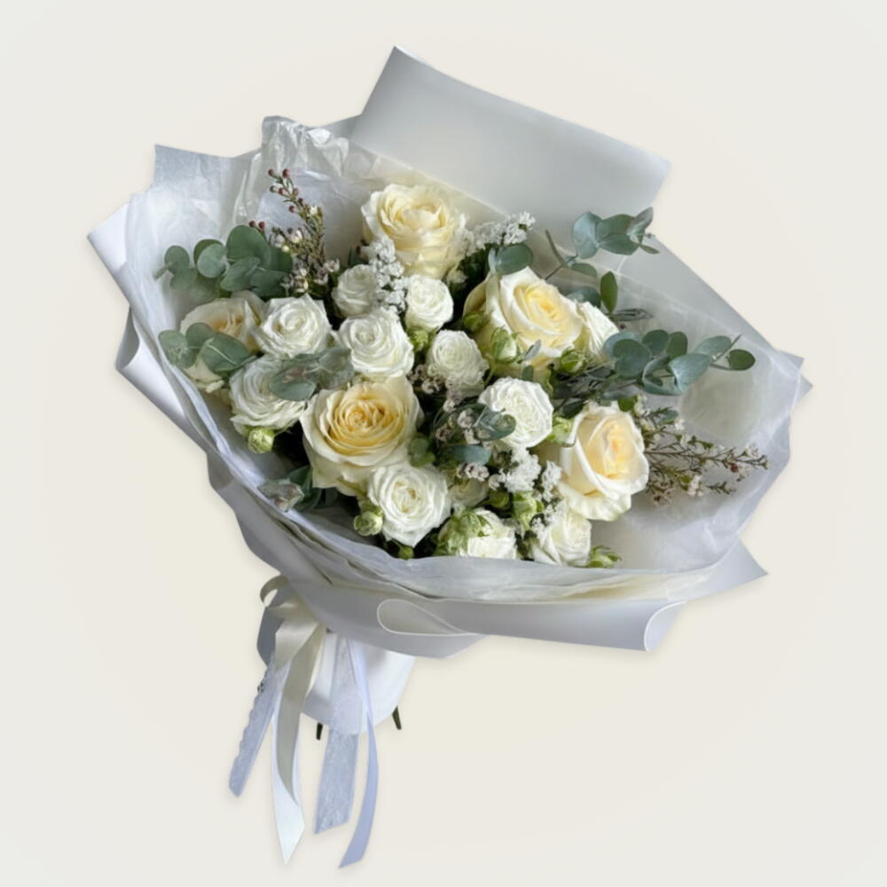 Eucalyptus - 3 шт. Gypsophila - 1 шт. wax - 2 шт. white wax - 5 шт. персиковые розы - 5 шт. белые беби-розы - 5 шт.