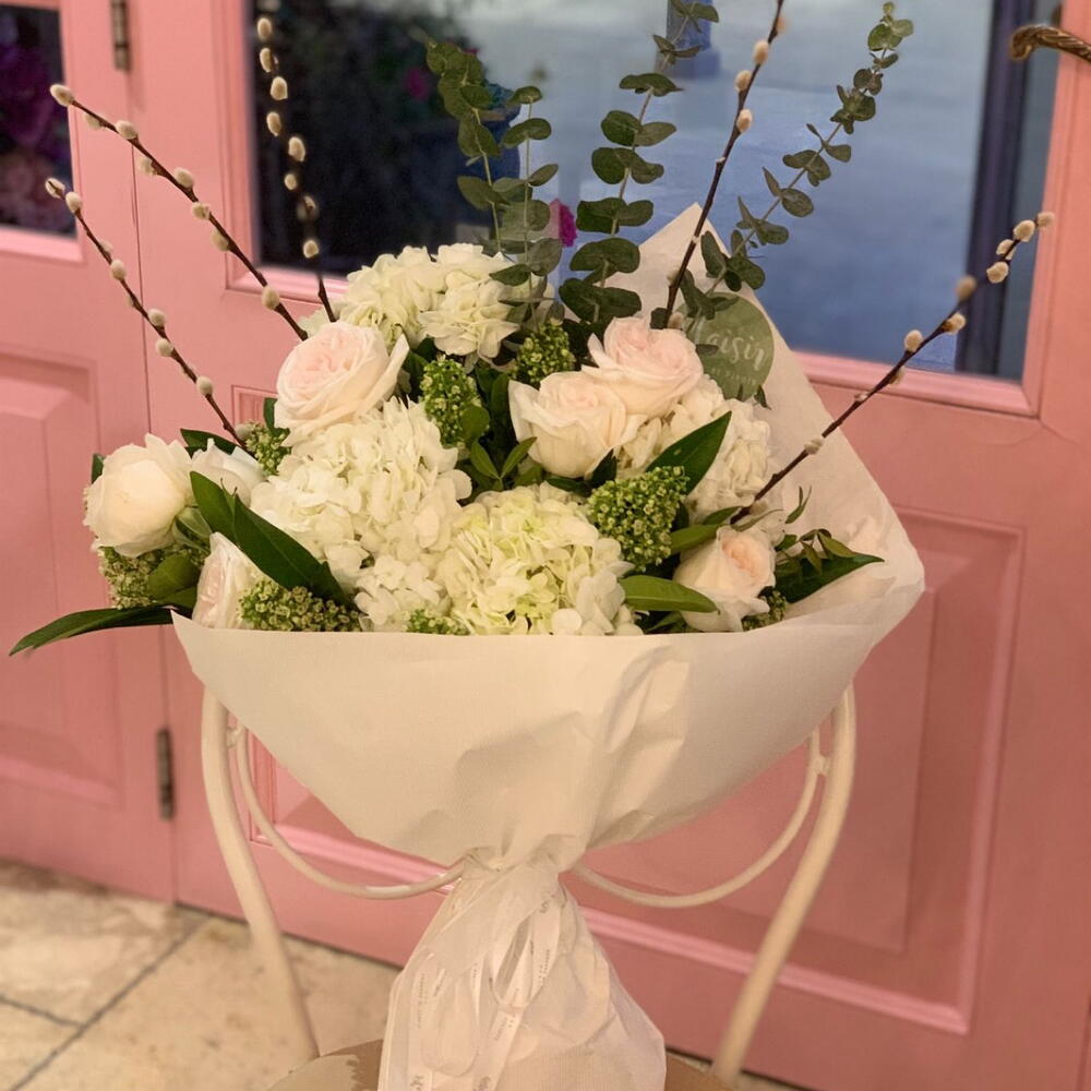 Великолепные белые сезонные цветы, включая гортензии, розы, ивы и эвкалипт, делают этот букет подходящим для любых случаев. Подходит для любого мужчины или женщины, с белыми вы всегда в выигрыше!