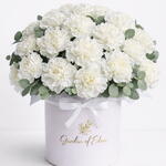 белые гвоздики. - 25 шт. дизайнерская коробка. - 1 шт. зеленый эвкалипт - 3 шт.