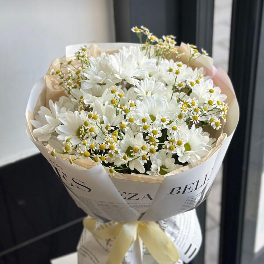 daisy - 6 шт. wrapping paper - 4 шт. белые хризантемы - 5 шт.