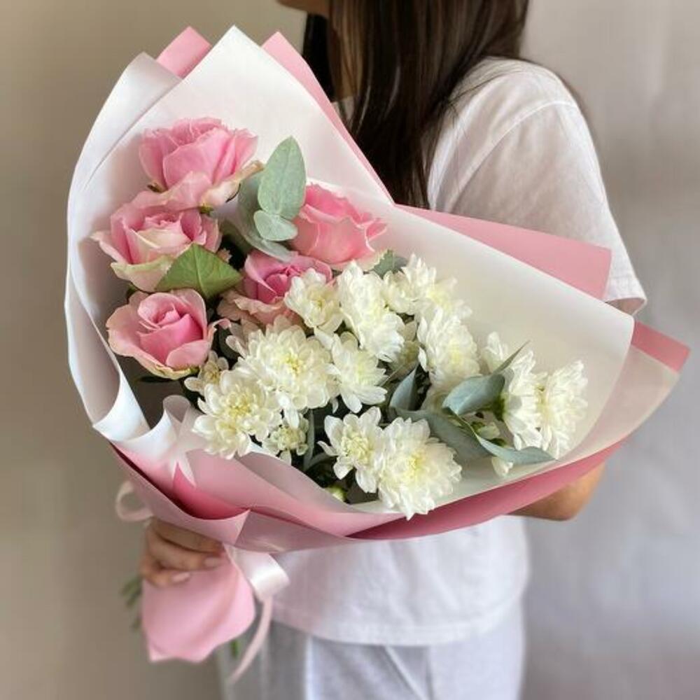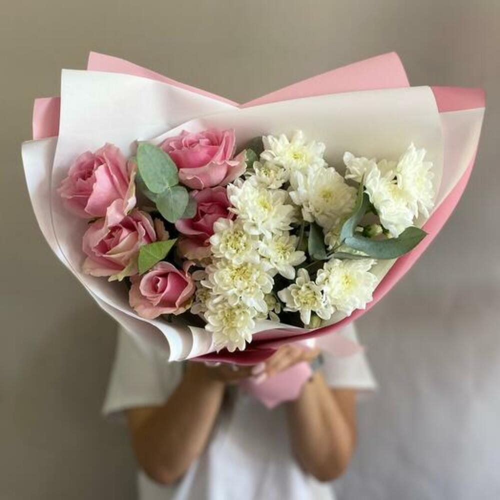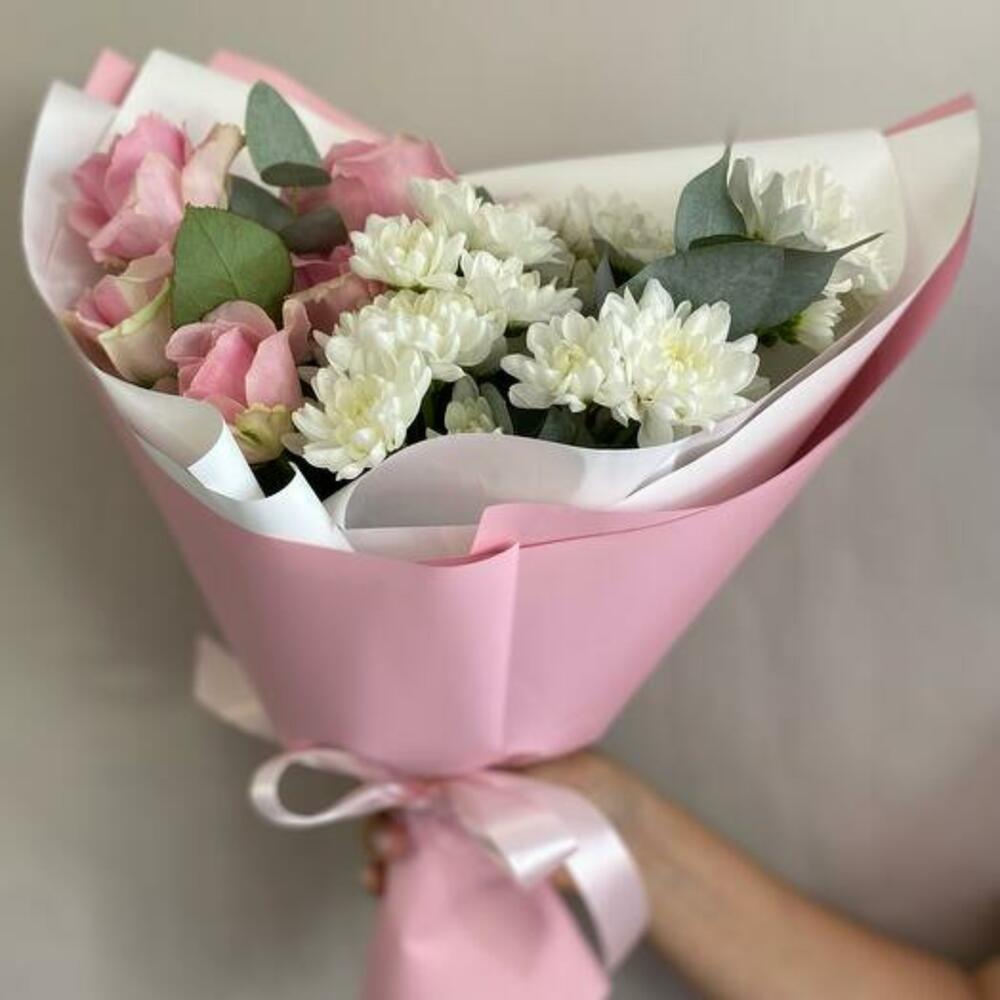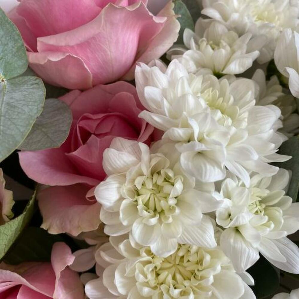 Ощутите спокойную элегантность нашего букета с белоснежными хризантемами, нежными розами и свежим эвкалиптом. Эта изысканная композиция сочетает нежные цветы с пышной зеленью, создавая изящный и вневременной образ. Этот букет идеально подходит для любого случая, где требуется изысканность и красота. Он искусно составлен и готов произвести впечатление.