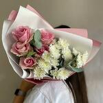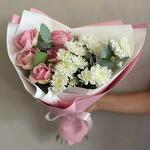 Satin ribbon - 1 шт. Eucalyptus - 2 шт. chrysanthemum bush - 5 шт. rose pink - 5 шт. дизайн упаковки - 1 шт.